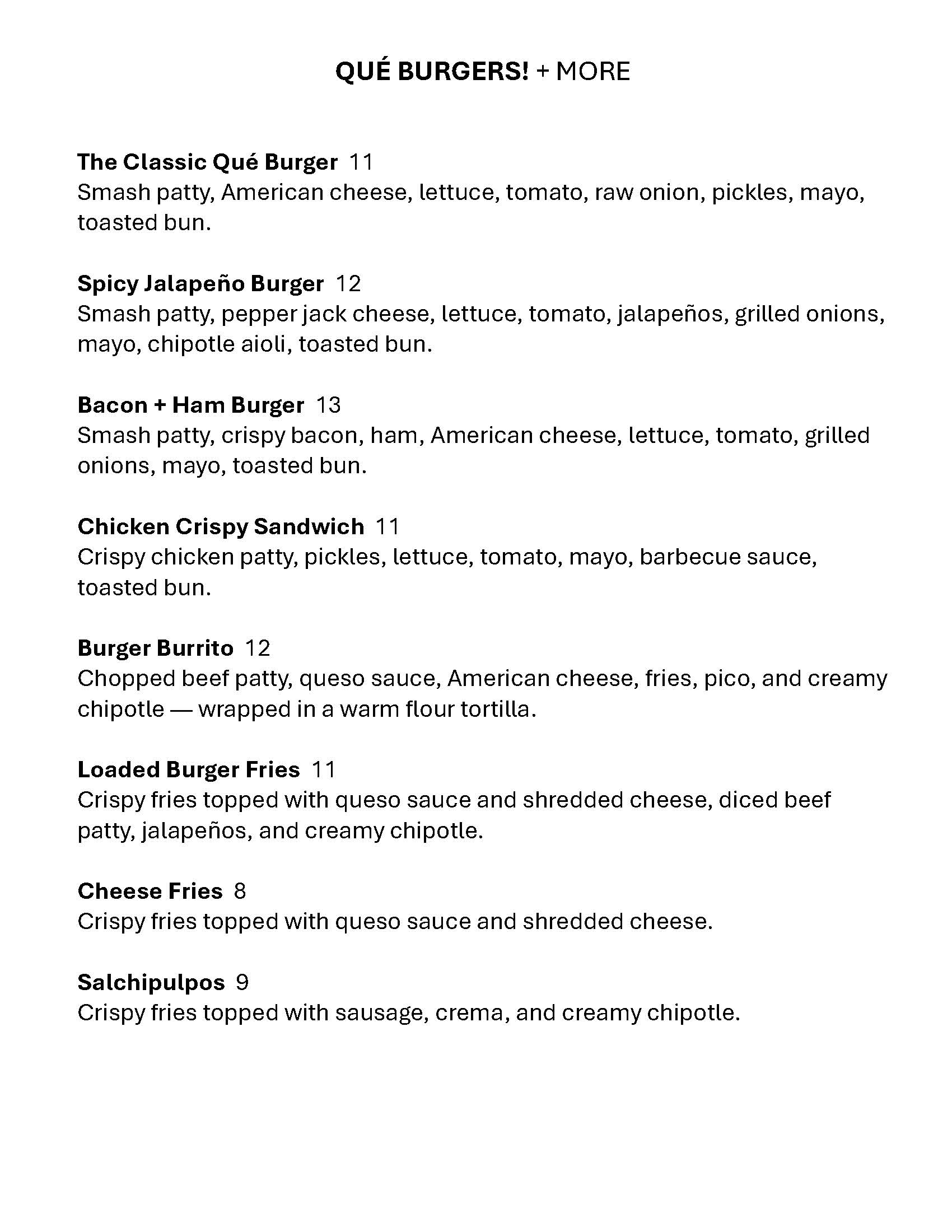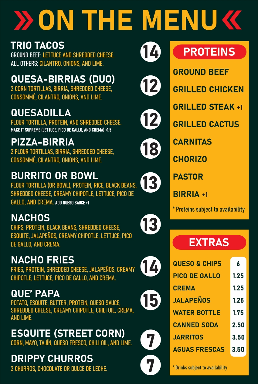*Menu items and pricing is subject to change without notice. Please see Que Tacos Taco Truck onsite for current menu and pricing.